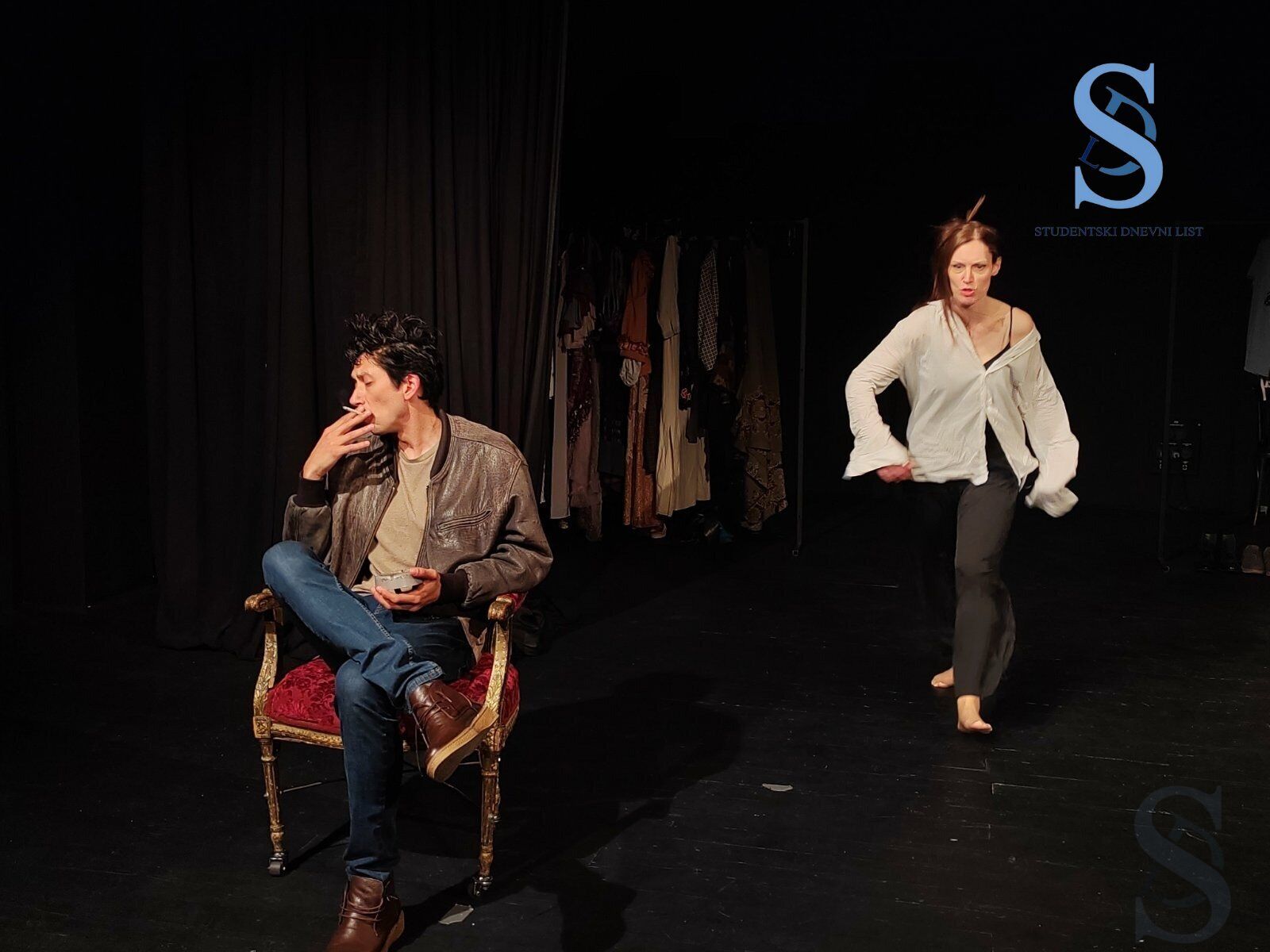 Glumac Miloš Cvetković većinu predstave igra ulogu reditelja. Kako se scene i situacije menjaju, ovo može da bude pravi glumački izazov. U jednom trenutku je mlad reditelj početnik, u već sledećem stari reditelj koji pored toga što je hipohondar, počinje da pokazuje i početne simptome demencije. Ovaj dobro poznati niški glumac, još jednom je pokazao talenat koji poseduje prelazeći iz uloge u ulogu u razmaku od minut i po, a ništa manje talentovana nije ni glumica Katarina koja je većinu vremena bila glumica koja radi sa rediteljem.